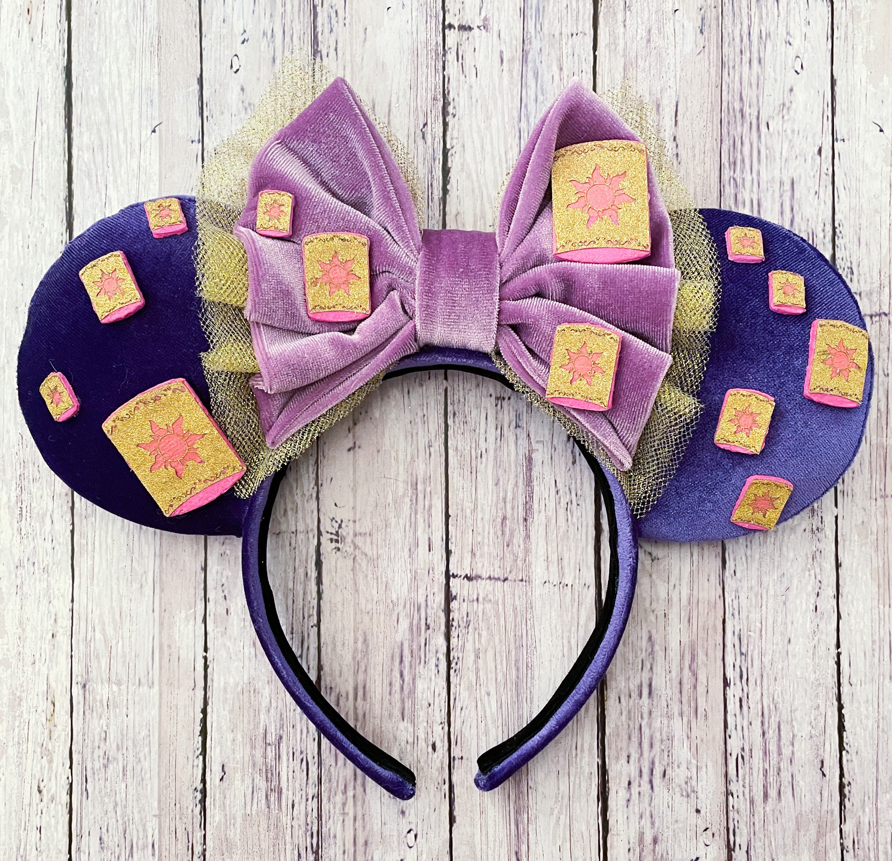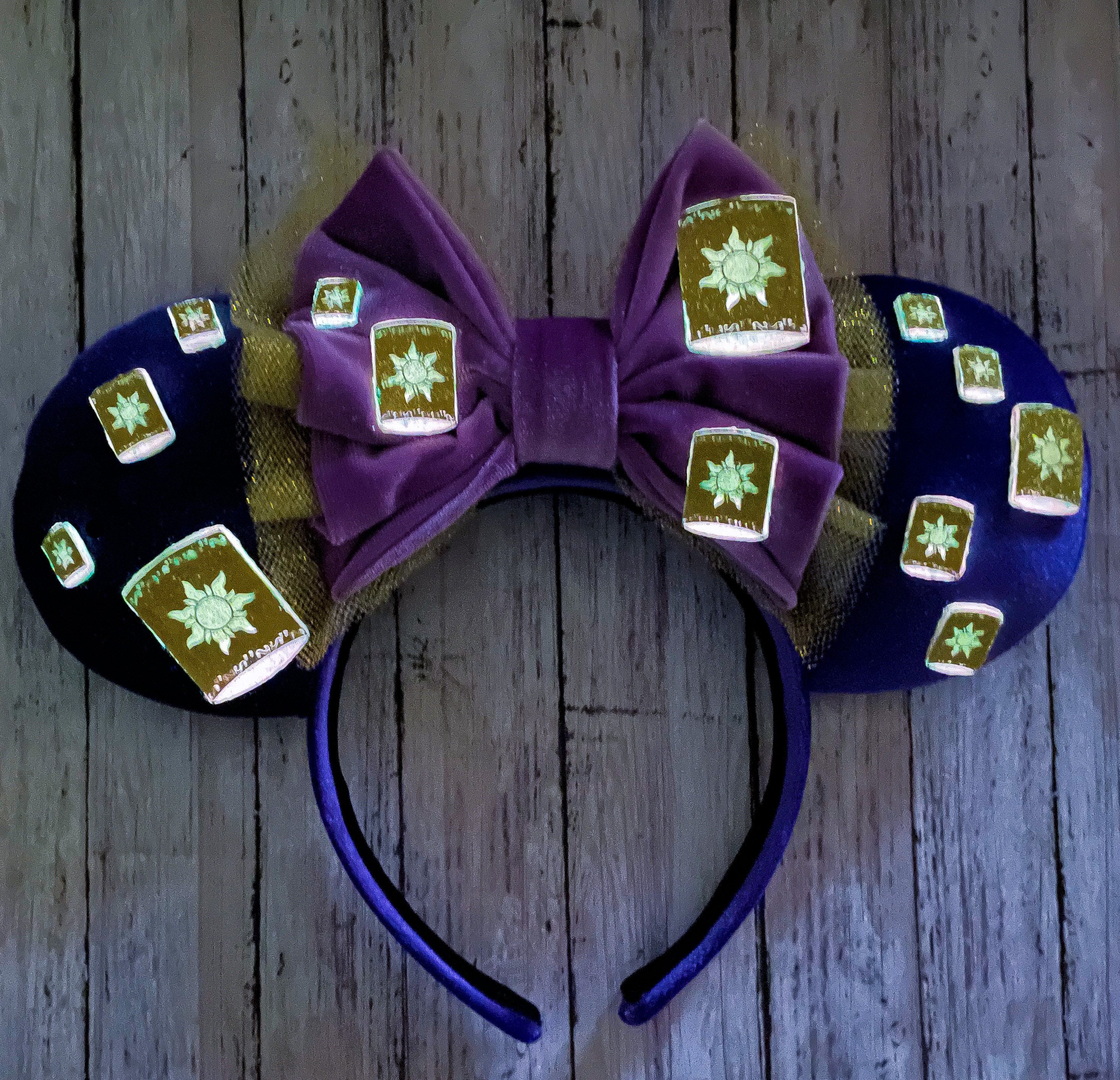 These Tangled Inspired ears are a purple velvet with GLOW IN THE DARK lanterns