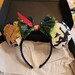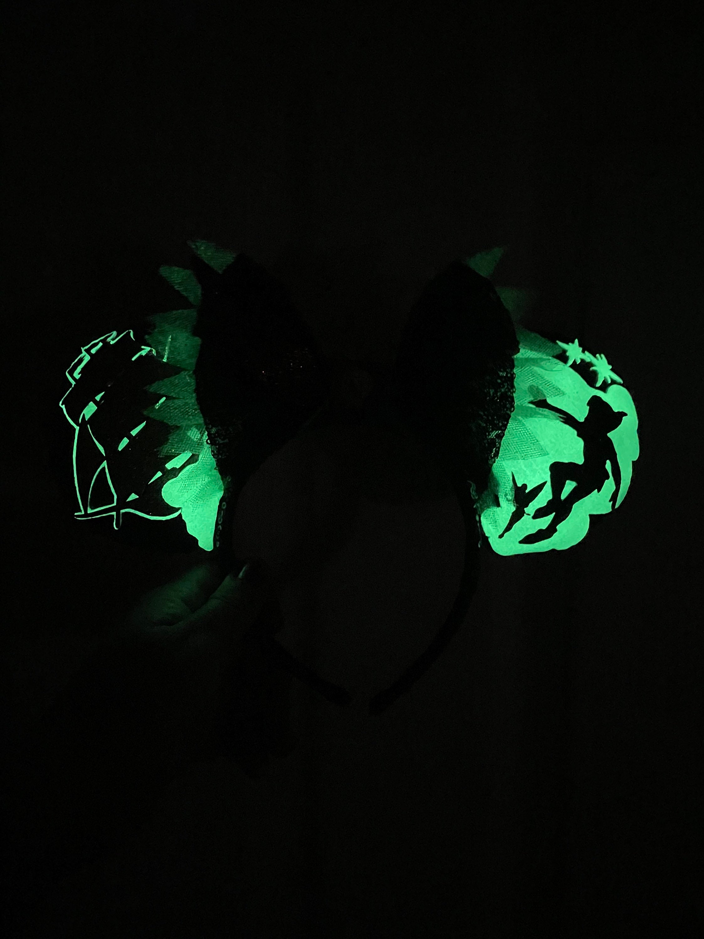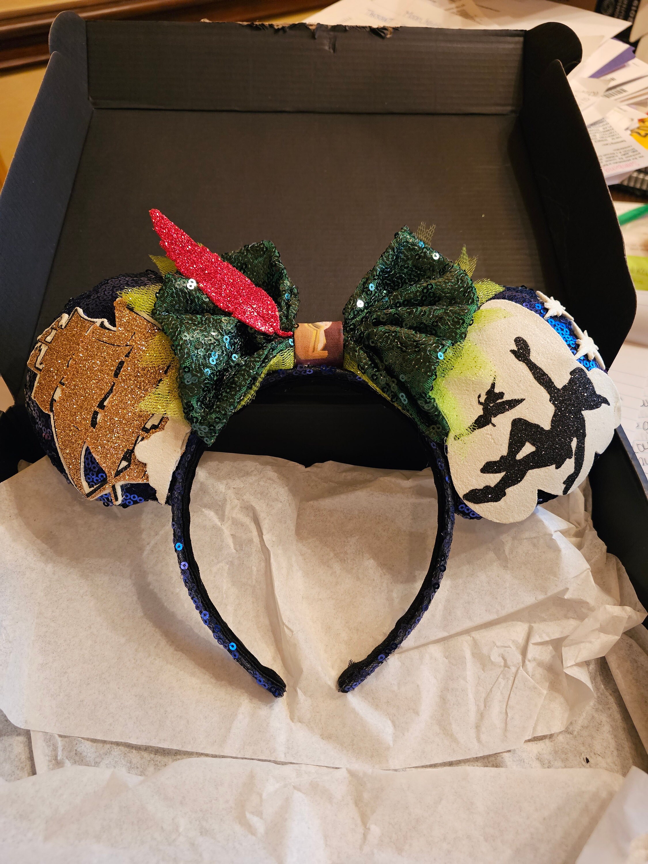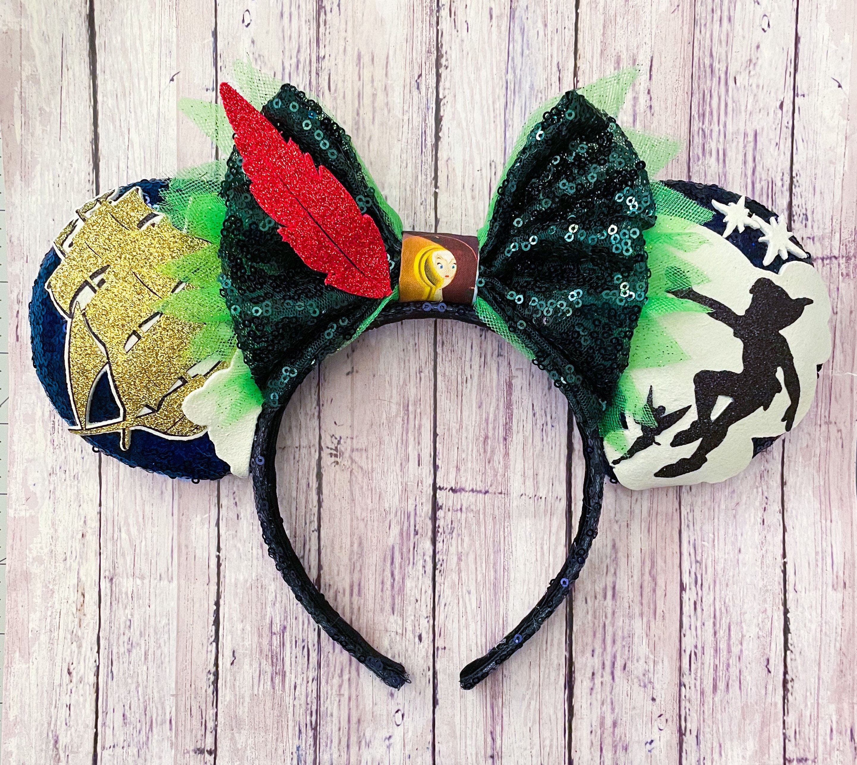 Blue sequin ears with a green sequin and tulle bow featuring scenes inspired by Peter Pan.**TURNAROUND TIME IS 6 WEEKS**