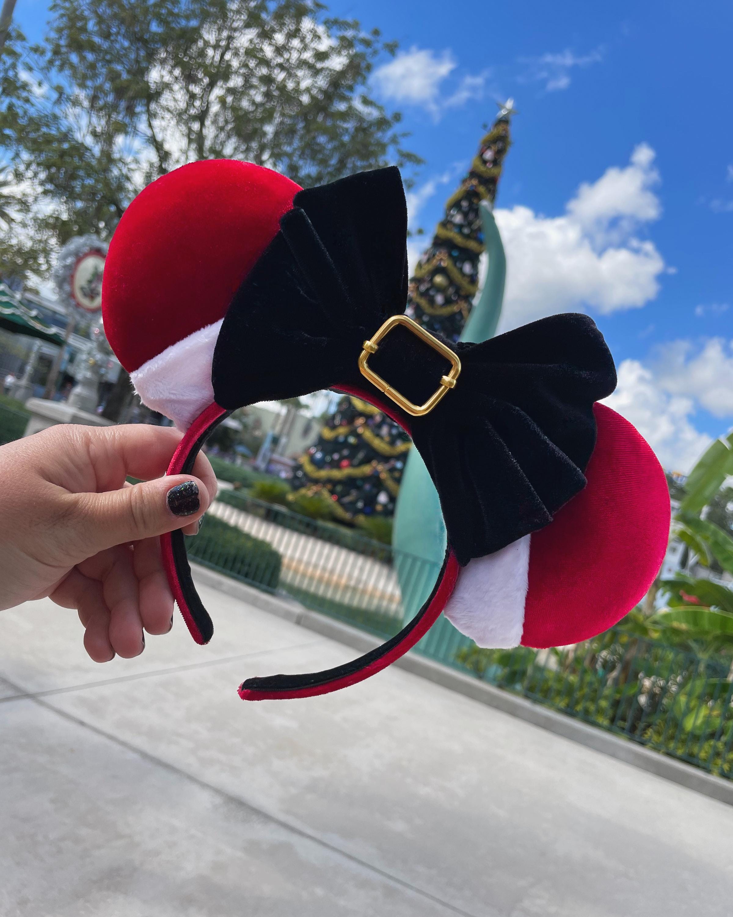 Red Velvet ears with white fluff and a black belt buckle bow to help you stay Jolly**TURNAROUND TIME IS 6 WEEKS**