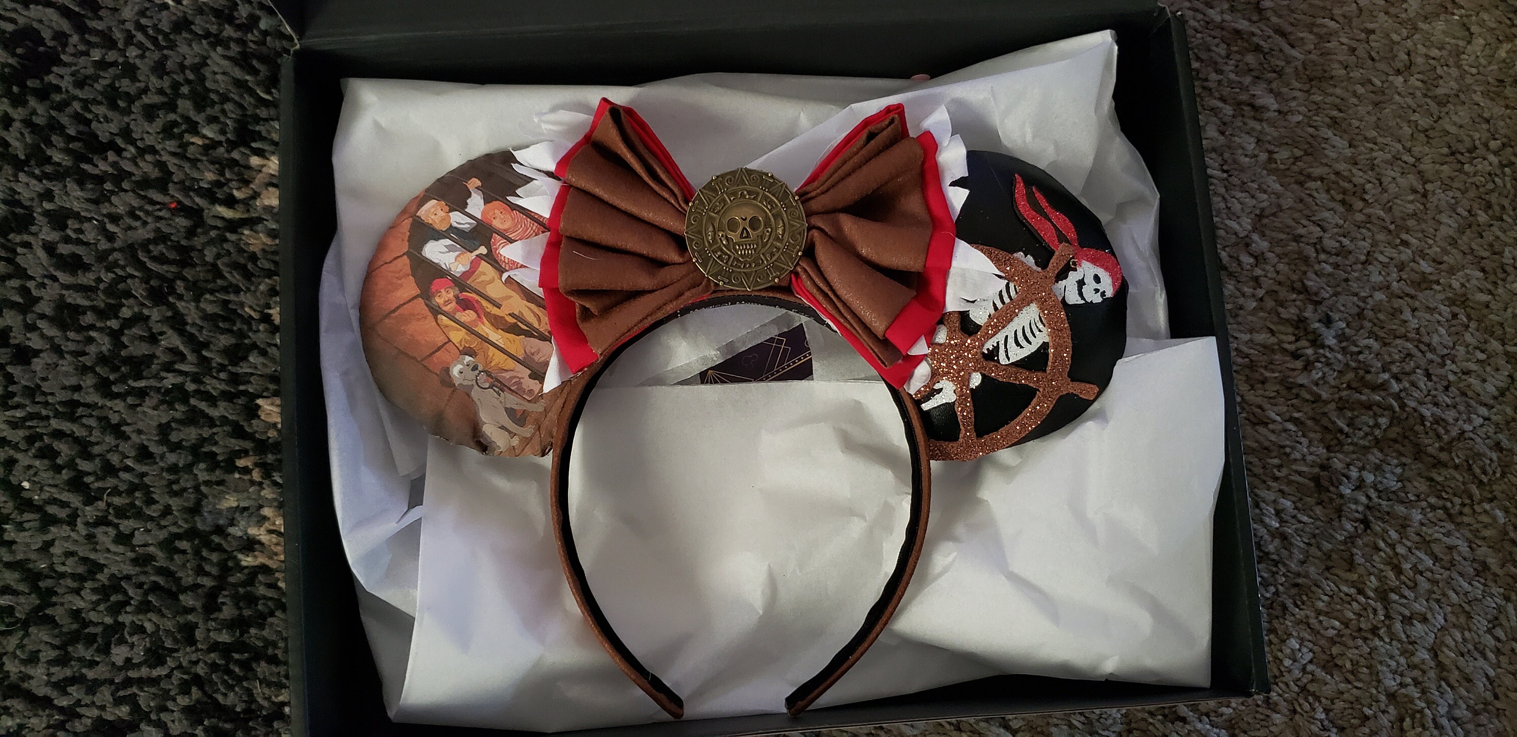 These are one of my favorite pairs of ears! The attention to detail is fabulous. The bow has a faux leather brown layer, and linen ish red and white layers, so it screams Pirates with just the fabric and color choices. And the white fabric is cut so it looks like a torn sail or something and that's just *chef's kiss* perfection. The fabric on the ears is so cute; it's scenes right out of the ride. The foam overlays of the skeleton steering the helm in the storm is cut and attached so perfectly-no glue showing or anything. And the 'dead men tell no tales' on the back is equally amazing. I ordered these well after the seller closed orders for the holidays, so I got them 2 months after ordering, but that was totally expected since I'm sure they were slammed with holiday orders. If you're on the fence, buy them<3