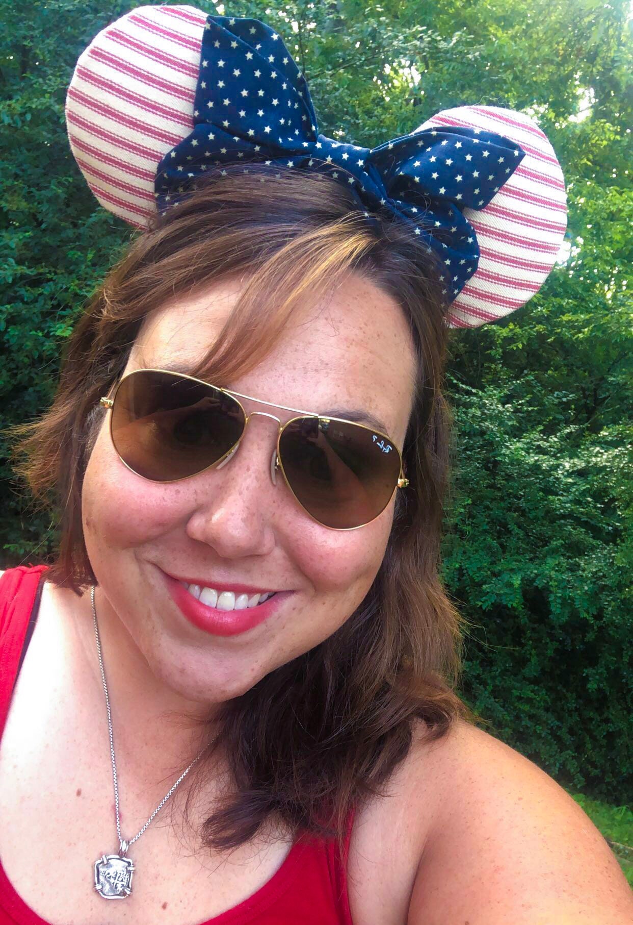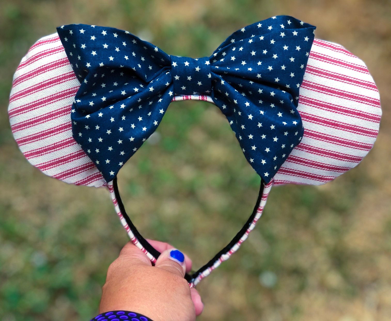 These Ears have a retro American Flag inspiration and Feature red and white striped ears with a navy bow with white stars.