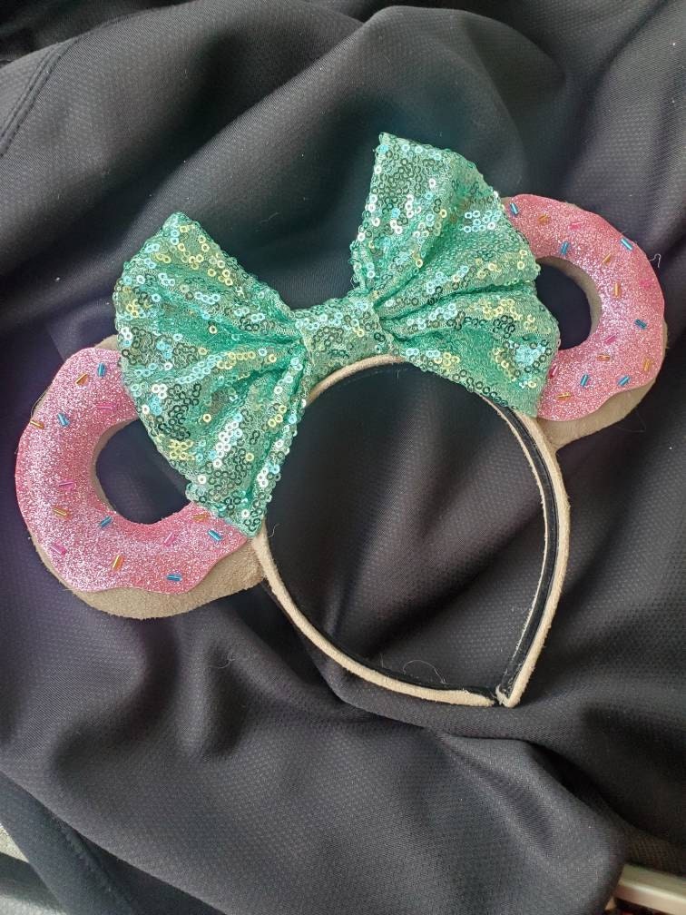 Chocolate Mickey donuts with sprinkles and a pink sequin bow!