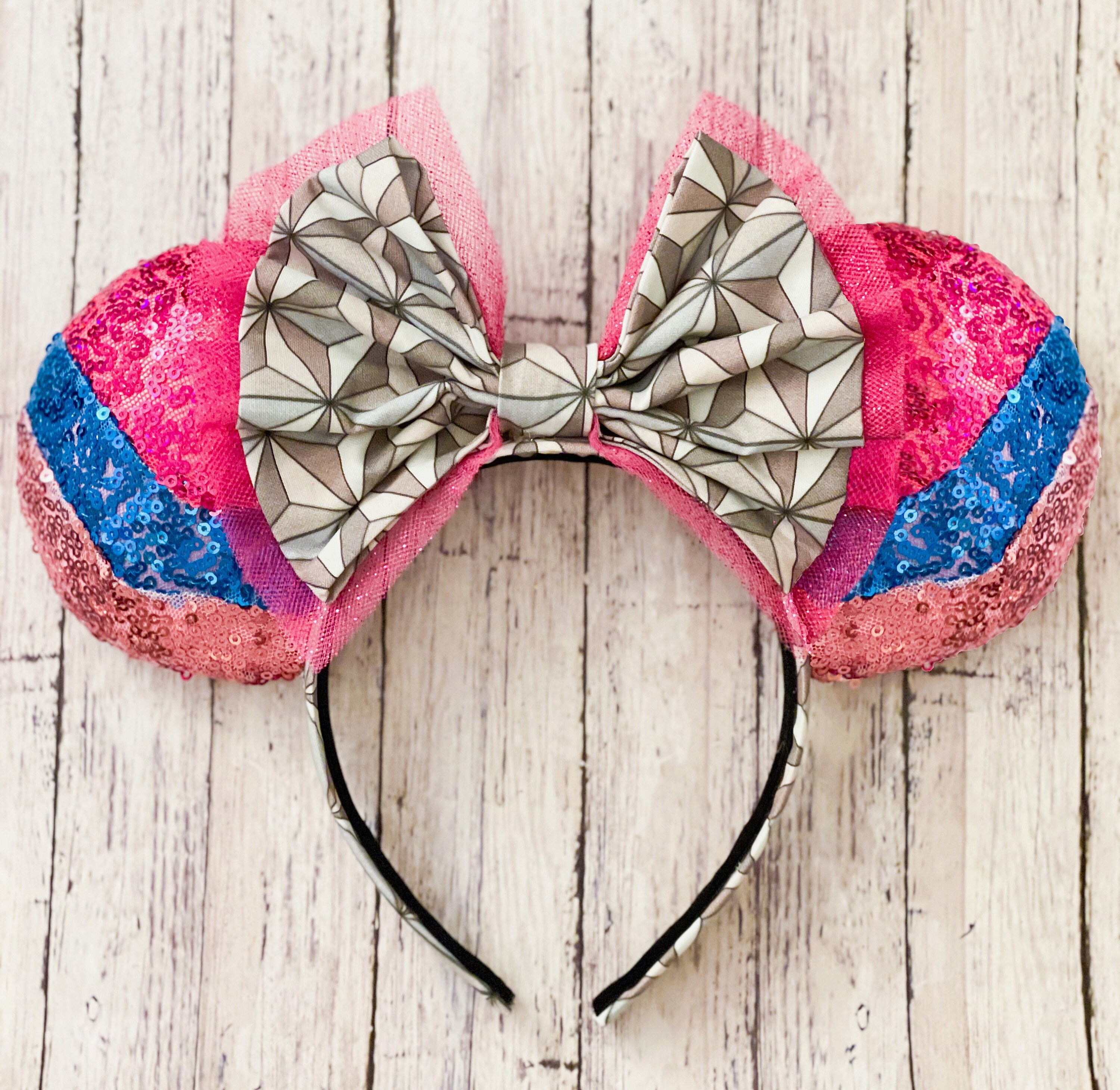 Featuring multi colored sequin ears with a spaceship earth themed bow.**TURNAROUND TIME IS 6 WEEKS**